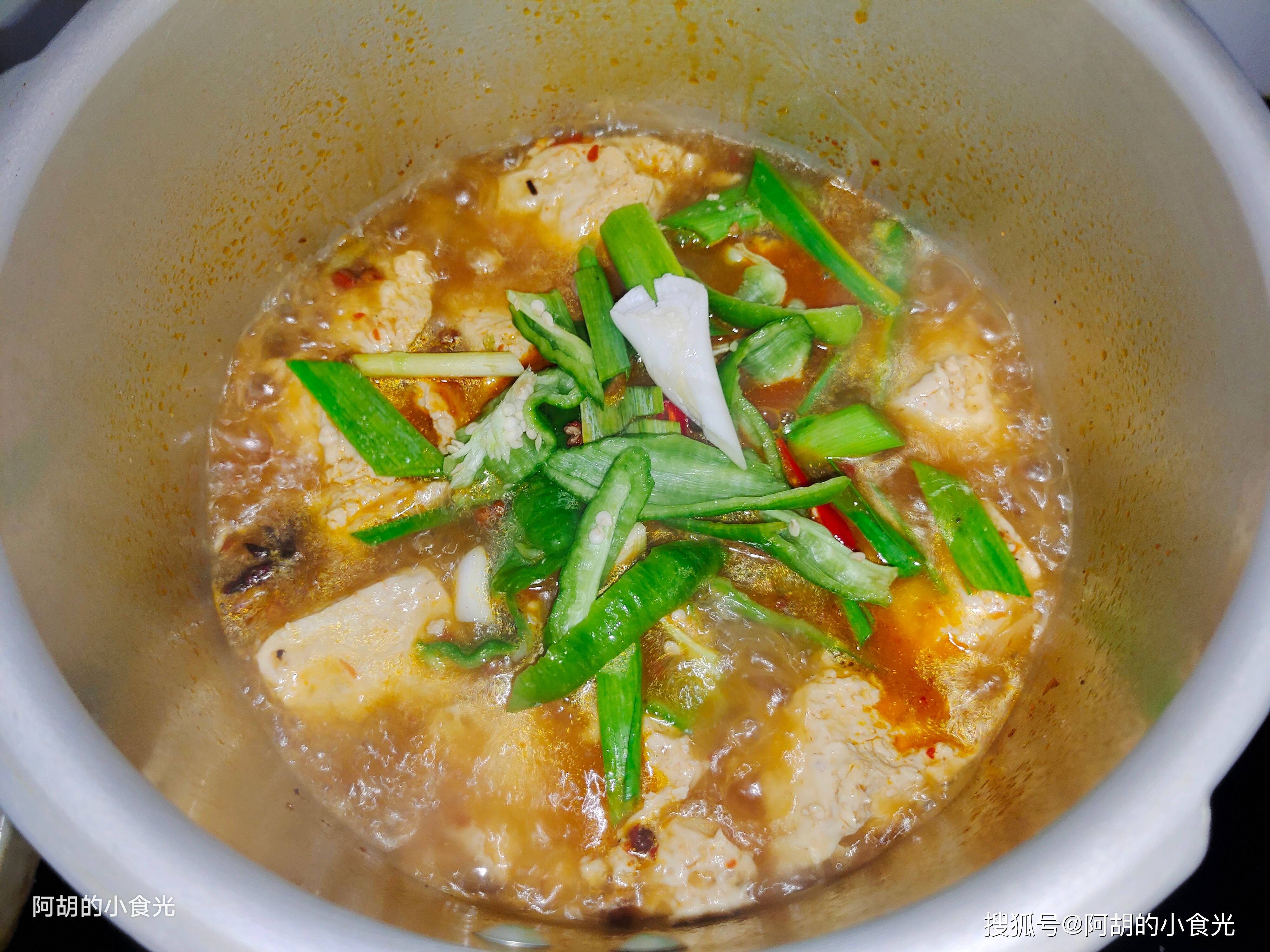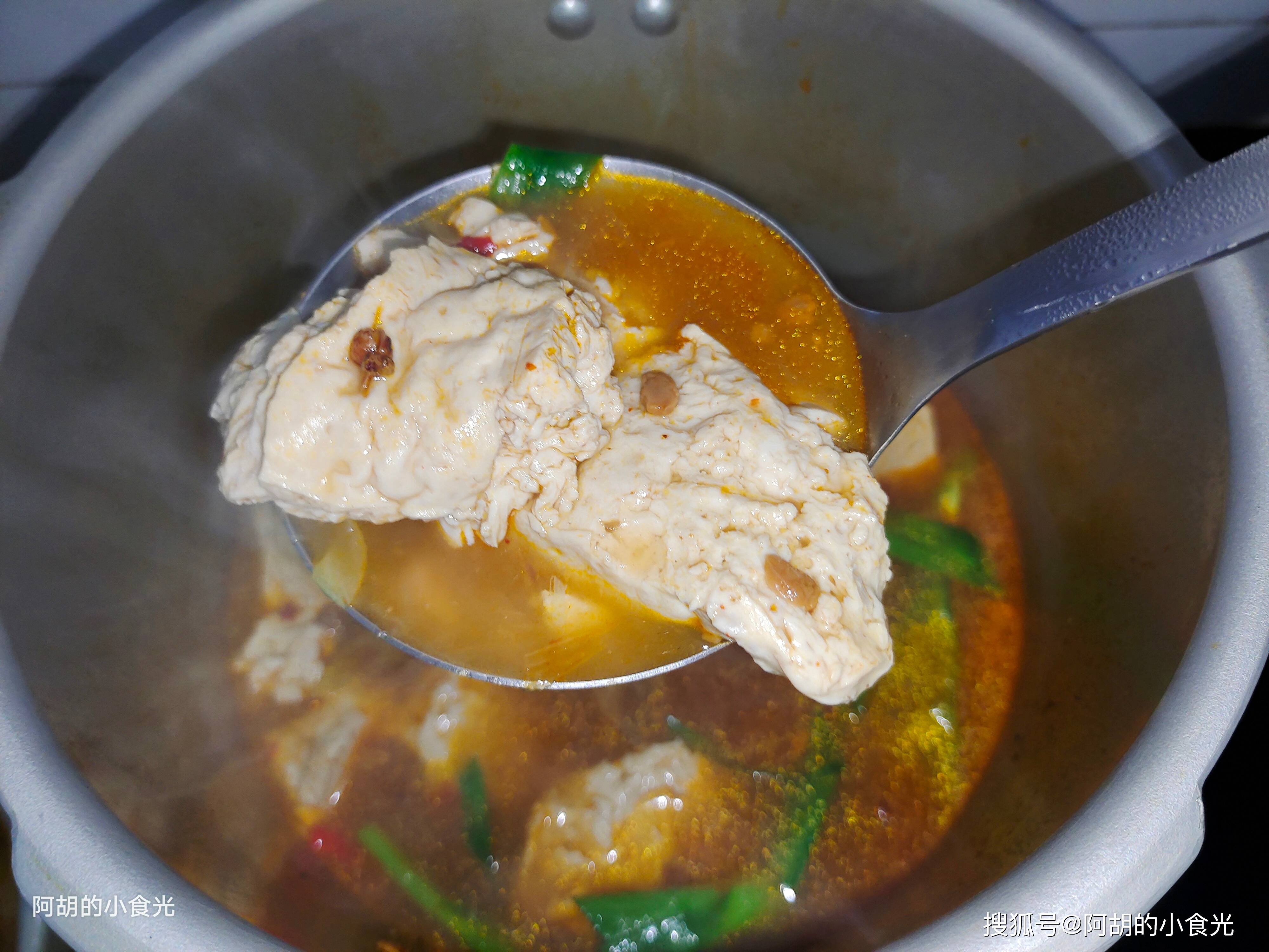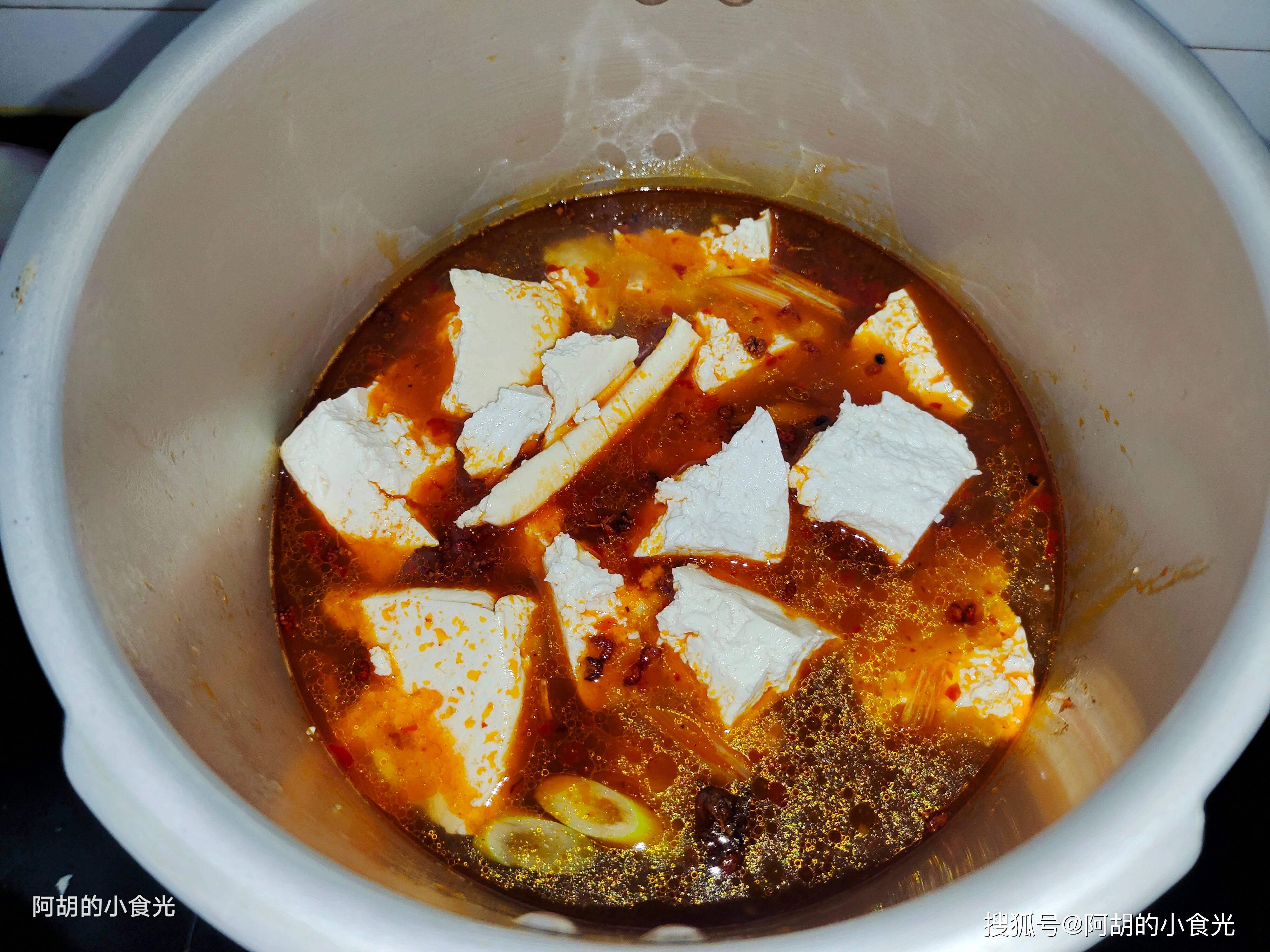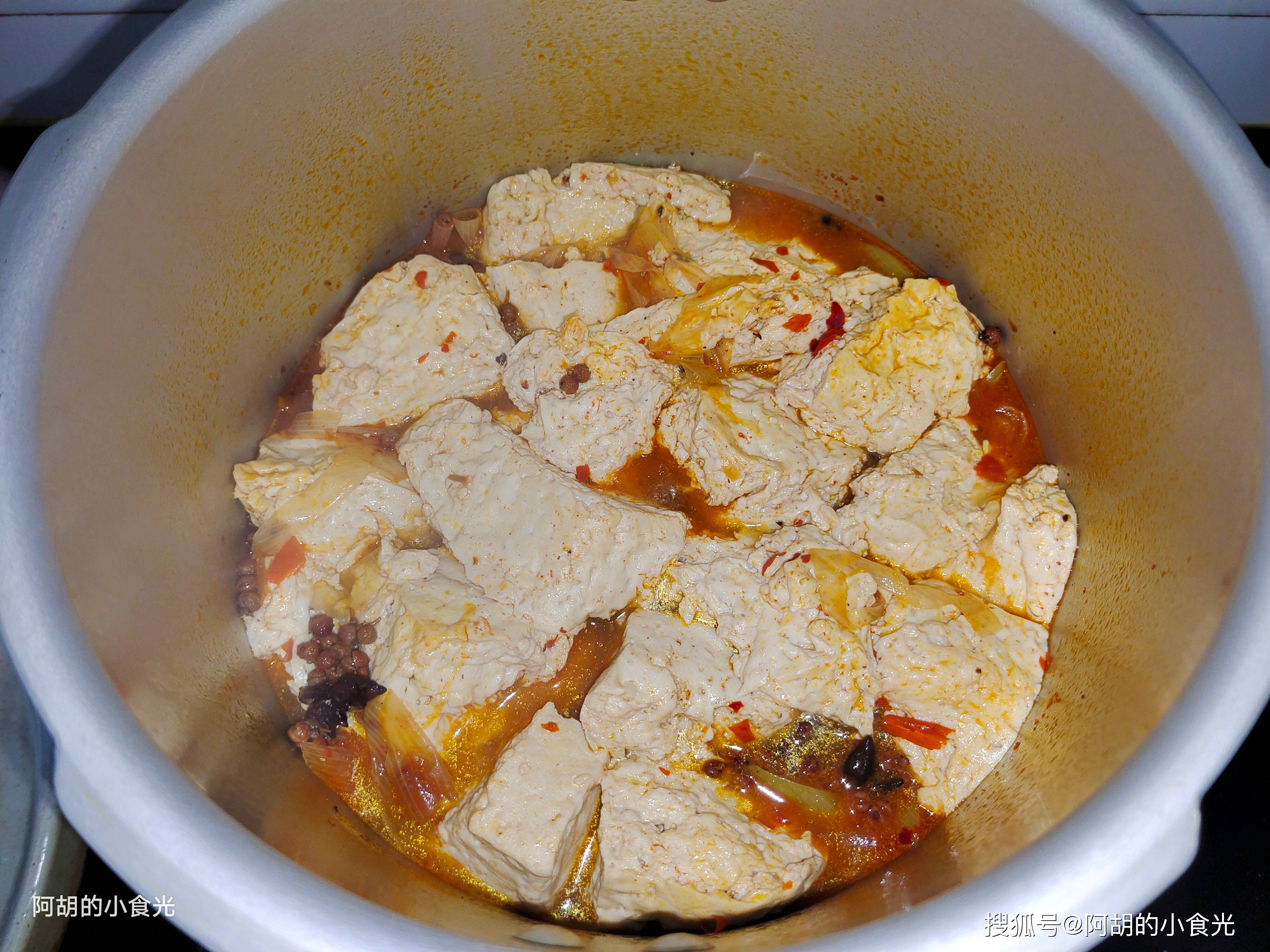 第五步:下面才是这道压锅豆腐的灵魂所在,高压锅加盖后保持大火炖煮至其上汽,而后转为小火压个五分钟时间即可,放汽后开盖,这时豆腐块有些变大,而且更为软嫩起来,关键是豆腐表面和内部出现了很多小孔,可以吸收汤汁的滋味。