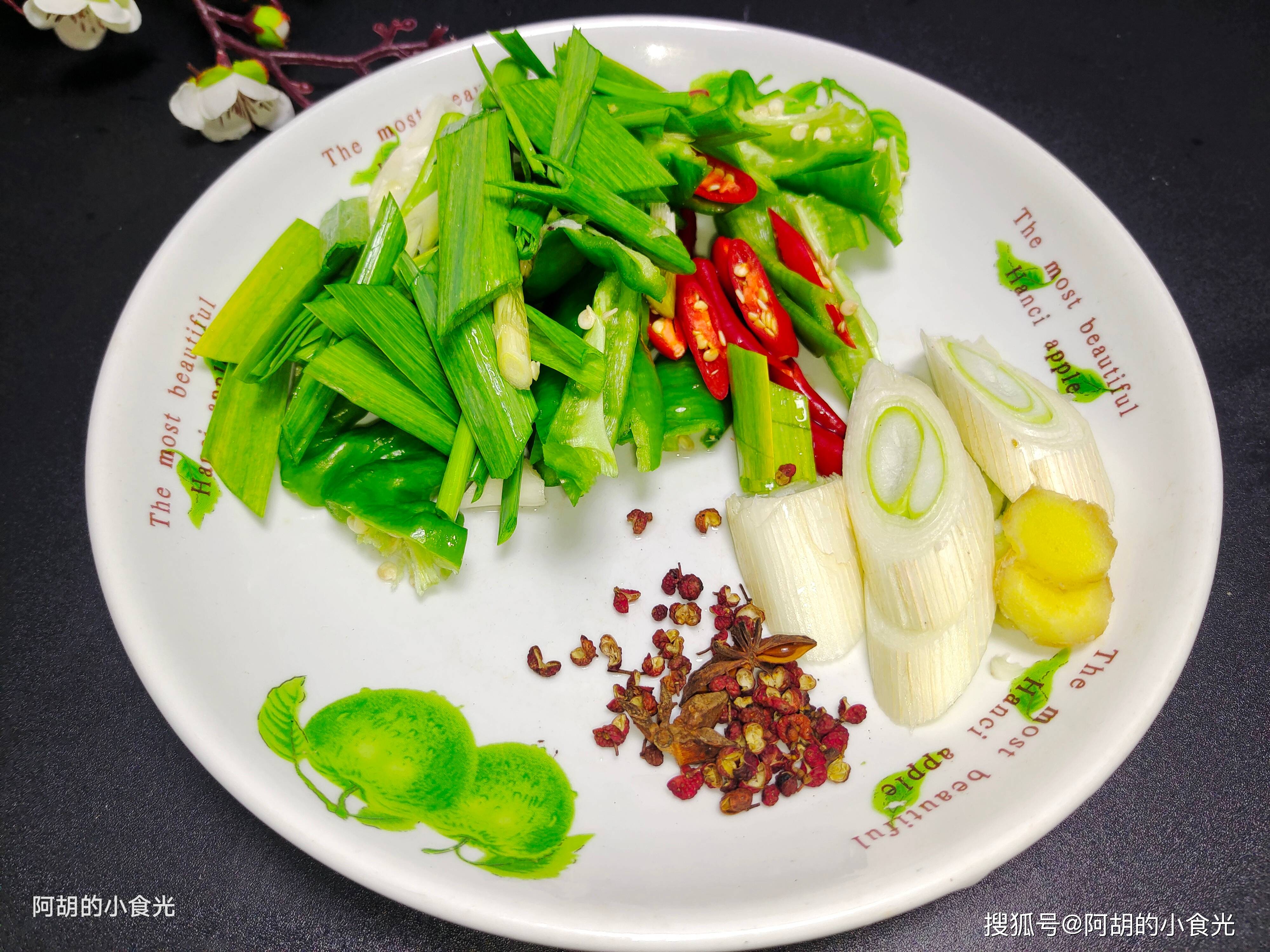 第二步:再来准备一些配料,有青红椒适量切块,喜欢辣味的可以用红米椒代替,再搭配一些青蒜苗切小段即可,而后还有一个八角,一小把的干花椒,适量的葱姜蒜,还有一汤匙的郫县豆瓣酱和黄豆酱也要提前备好。