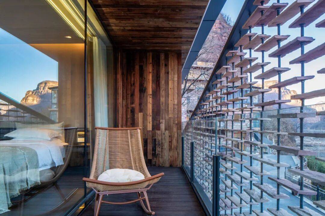 观景阳台与不规则取景洞口,引导视线与光影变化,营造静谧旅居氛围。