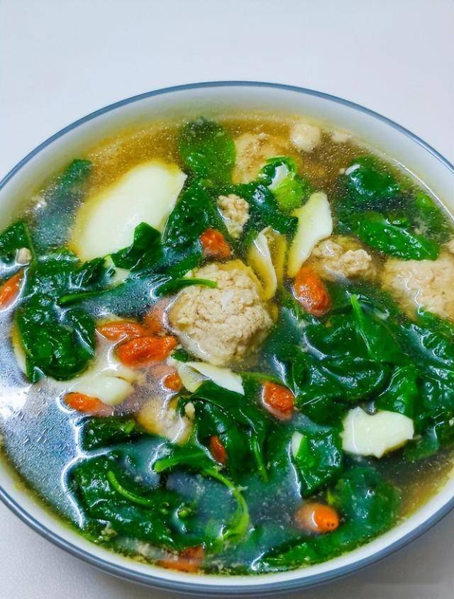 搅拌肉馅时要顺一个方向,这样丸子更有弹性。煮丸子时先小火,等丸子定型后再转大火,防止丸子散开。枸杞叶易熟,不要煮太久,以免营养流失。