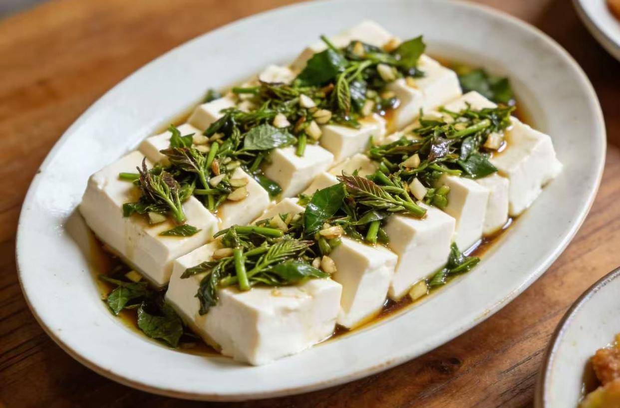 香椿拌豆腐是一道清爽可口的凉菜。将香椿洗净焯烫去涩,切碎后备用。嫩豆腐切块摆盘,把香椿碎加少许盐、香油、凉拌酱油、葱花、蒜末拌匀后浇到豆腐块上,清淡爽口,满口都是香椿的清香。此外,香椿炒鸡蛋也是春日限定美味,简单一做,就能吃出春天的仪式感,让人感受到春天的独特魅力。