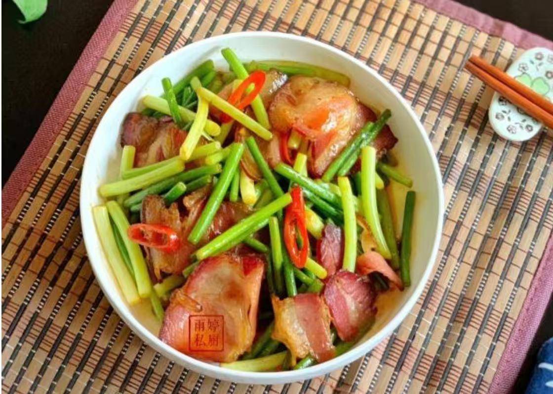 清明前后的蒜苔,正是最嫩的时候,颜色翠绿、口感脆爽,没有老蒜苔的硬柴味,是春天餐桌上当之无愧的“黄金菜”。蒜苔自带一股清香,开胃又解腻,和腊肉一起炒,鲜香味直接翻倍,是很多人家开春必吃的一道家常菜。