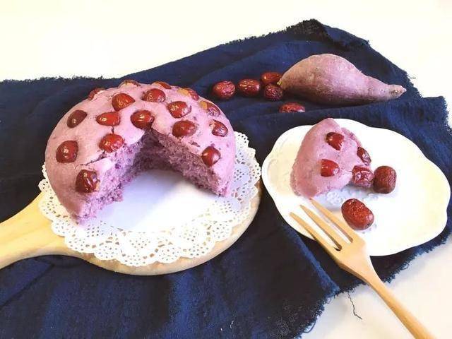 材 料紫薯200g,高筋面粉450g、细砂糖60g,盐3g,水80g、酵母3g,红枣适量,食用油适量