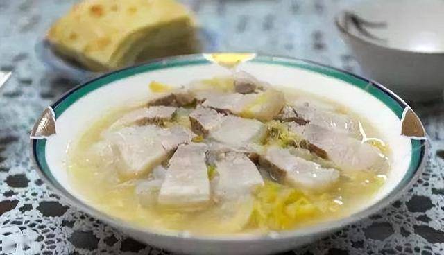 4、加入开水,大火将汤熬开。然后放入切好的白肉片,中火煮5分钟;然后调入鸡精、香油,起锅的时候,撒上葱花。