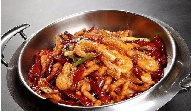 3、锅里放少量油,放切碎的干红辣椒和花椒,炸出辣味后放葱姜,然后放入土豆条和虾;放适量辣椒酱和少量盐煸炒几下,炒匀,撒点香菜即可关火出锅。