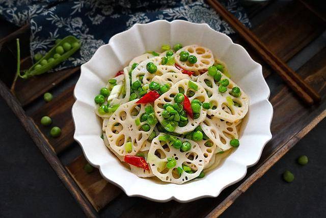【准备】莲藕1段、豌豆1把、辣椒1个、盐1茶匙、鸡精少许、葱1棵