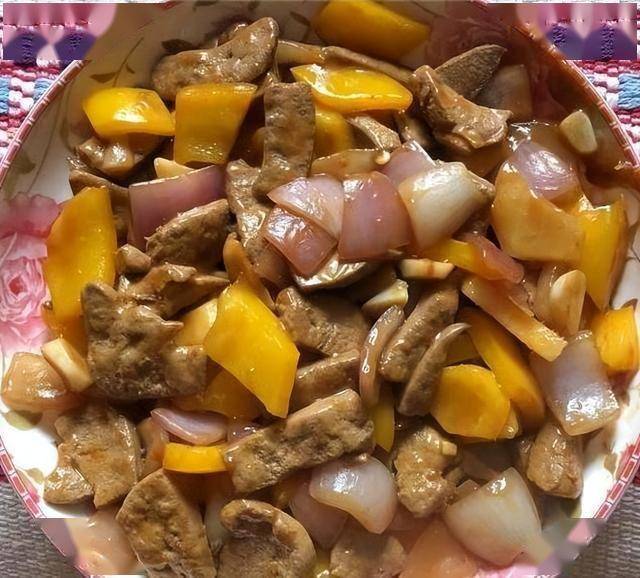 2、搅拌一下,略灰白的时候捞出沥干。锅中倒入适量油烧热,放入切好的洋葱煸炒香,再倒入切好的甜椒块一起翻炒一会,再倒入猪肝,