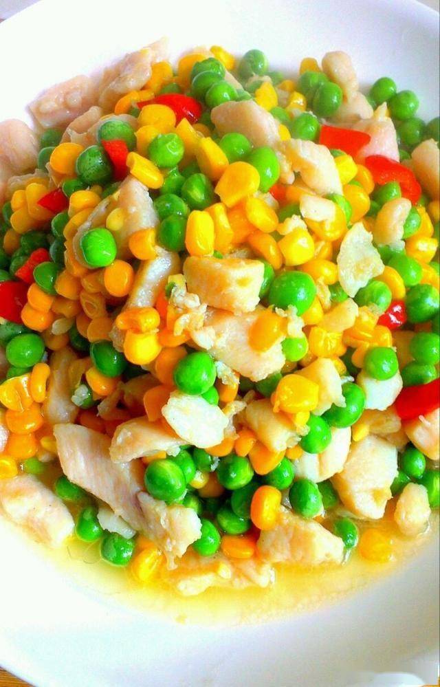 6. 调味出锅:加入1勺生抽、少许盐,翻炒均匀,翻炒10秒就可以关火装盘。软糯鲜香的三色鸡丁,孩子一口一个,吃得停不下来。