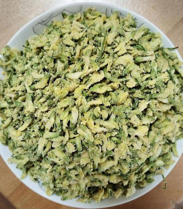 3. 确保每朵槐花都均匀裹上薄粉,呈松散状态不粘连,多余面粉筛掉