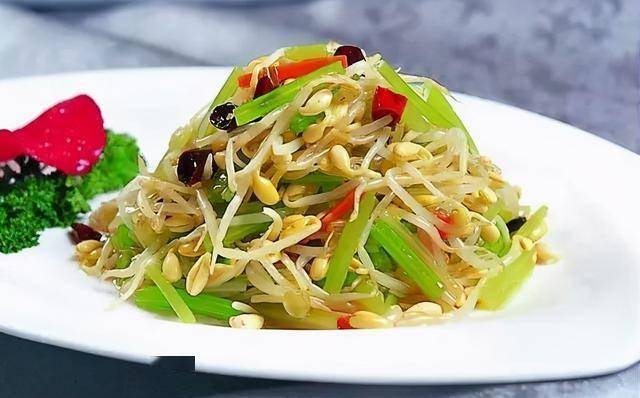 材料:小西芹、豆芽、大蒜、干辣椒、白糖、鸡精、香醋、食用盐、食用油
