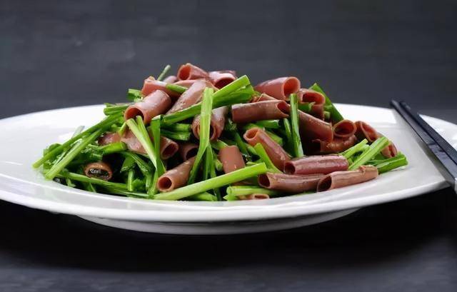 3.炒锅入少许油,油温八成热,入海肠爆炒至七成熟时放入韭菜,大火爆炒,用精盐、鸡精调好味即可起锅。