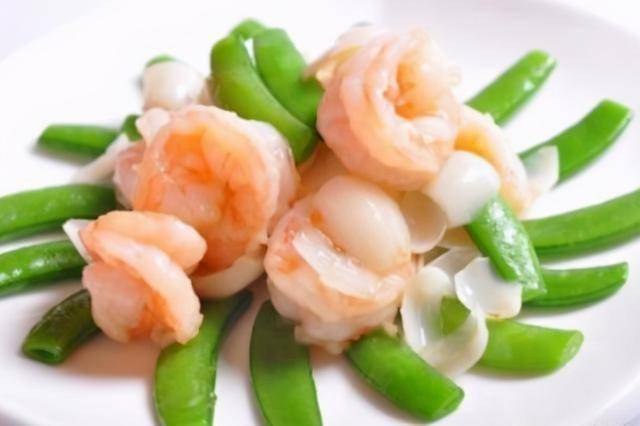 材料:鲜虾,百合,荷兰豆。葱末,盐,胡椒粉,糖,料酒,生抽。