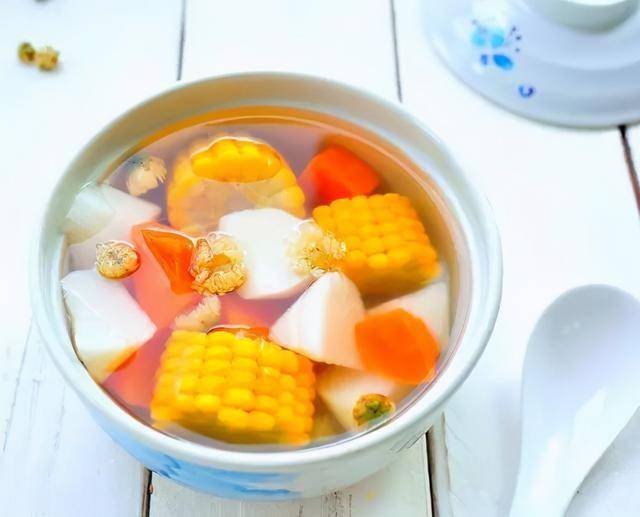 材 料:玉米250克、胡萝卜100克、山药150克、百合15克、菊花0、5克、姜4克、盐适量、蔬果调味粉适量