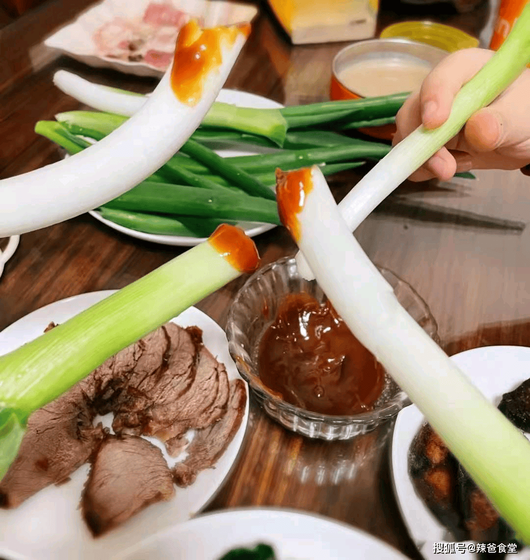 蘸酱菜用的食材,不同地方也有差别。东北的蘸酱菜食材最丰富,除了常见的黄瓜、大葱、生菜、苦苣、水萝卜,春天还有各种野菜,比如婆婆丁、曲麻菜、小根蒜,这些野菜带一点淡淡的苦味,蘸上大酱正好中和,解腻又去火,是东北人春天的限定美味。山东的蘸酱菜,最经典的就是大葱,尤其是章丘大葱,甜度高、辣味淡,直接蘸甜面酱吃,是很多山东人的最爱。不管是东北还是山东,都很喜欢用干豆腐卷上大葱、黄瓜、香菜,再蘸上酱,一口下去口感丰富,越吃越香。