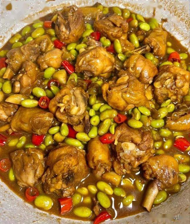 4.最后打开锅盖,转大火来收汁,在汤汁快收干之际,加入一点儿盐和鸡精进行调味,接着再翻炒上几下,就可以关火了。这道毛豆炸鸡呀,那可是香辣得让人过瘾,鸡肉十分鲜嫩,毛豆也入味极了,无论是用来下酒还是下饭,都特别合适呢!