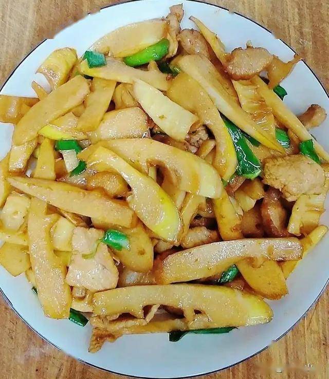 4. 合炒出锅:放入姜丝、干辣椒和蒜白部分,爆炒出香味。然后倒入焯好水的笋片,大火翻炒均匀。加入1勺生抽、半勺老抽(上色用)、少许盐和糖调味。因为笋比较吸味,可以稍微加一点点水焖一分钟,让它更入味。最后撒入青蒜叶,翻炒至断生,关火出锅!春笋的鲜嫩和五花肉的油香完美结合,绝配!