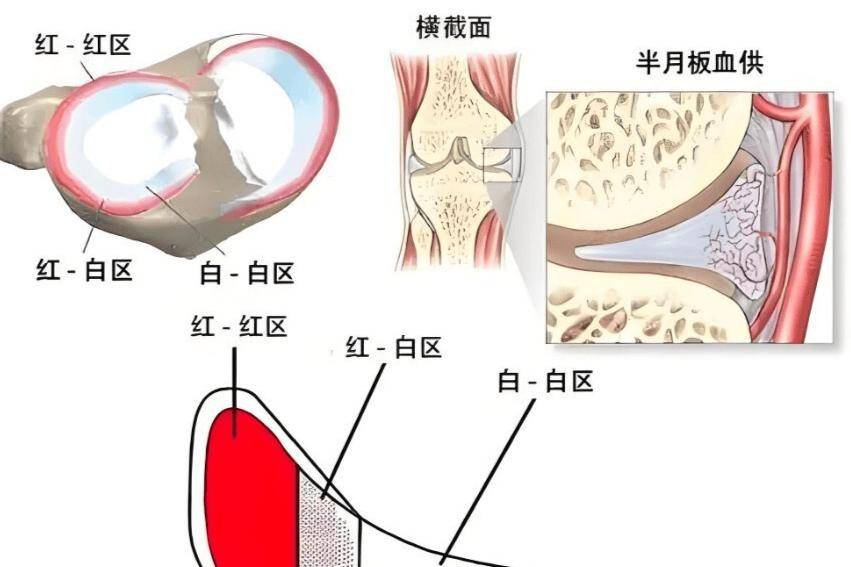半月板本身缺乏血液供应,只有最外围的“红区”大约30%的区域有毛细血管,有自我修复能力。越往半月板体部“白区”中心,营养越差,这种独特的血供分布,直接决定了半月板的修复能力,所以需要根据损伤区域以及损伤程度来制定详细的康复计划。