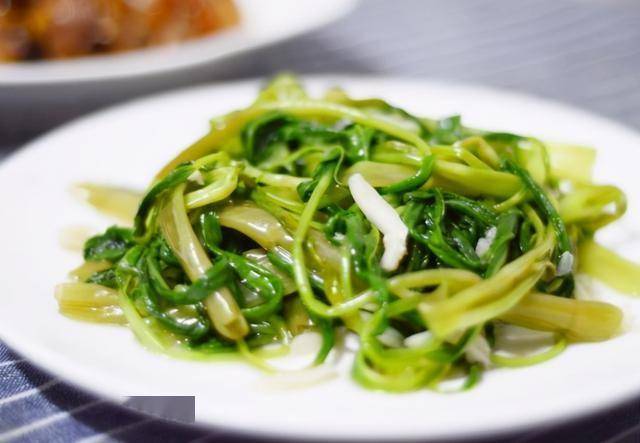 5. 当茎部快断生时,加入茼蒿的叶子,翻炒,加入盐、蔬果粉,叶子部分成熟时关火,盛出
