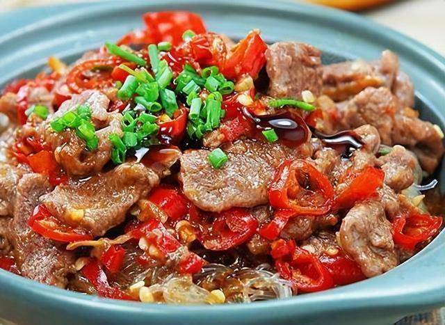 用料牛肉300g/粉丝1小把/泡红椒4个/食盐2g、白胡椒粉5g/料酒10g/淀粉3g/姜5g/蒜10g、细香葱1根/生抽5g/蚝油5g/植物油20g