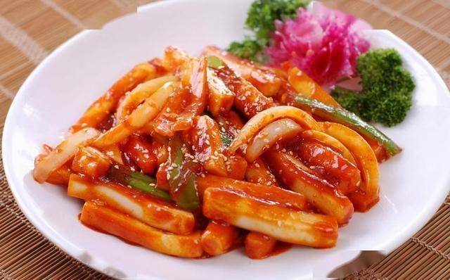 用料年糕条1包包菜半个或1个胡萝卜两根洋葱一颗韩国辣酱2勺韩国大酱1勺糖1勺韩国泡菜适量芝麻少许