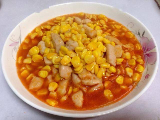 材料:鸡脯肉,西红柿,玉米粒,白糖,料酒,盐,淀粉