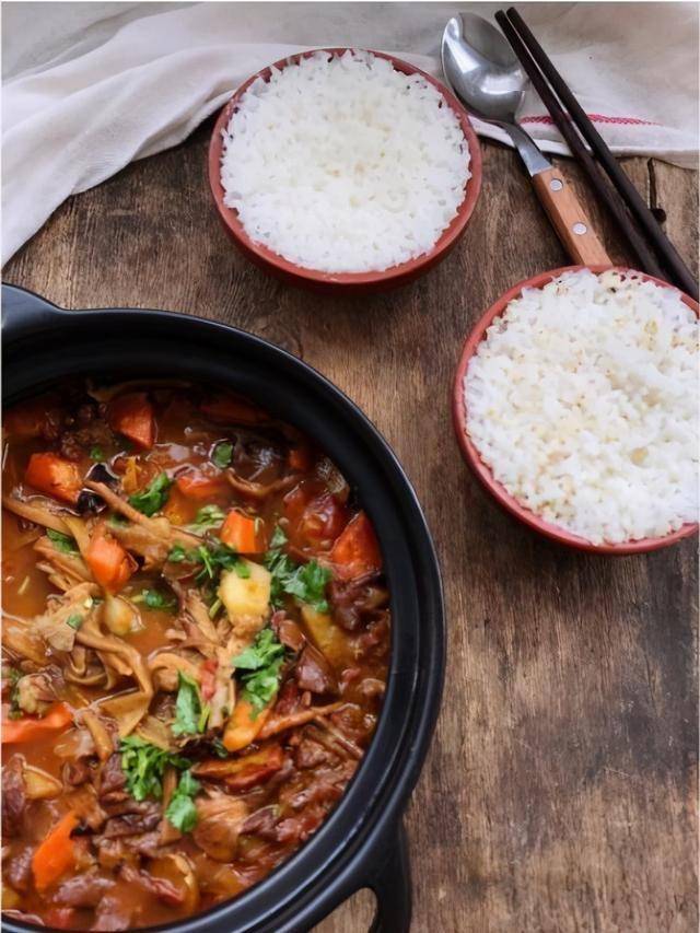 6. 接着转移到刚才的那口砂锅里,转小火慢炖两个小时,直至牛肉软烂即成。