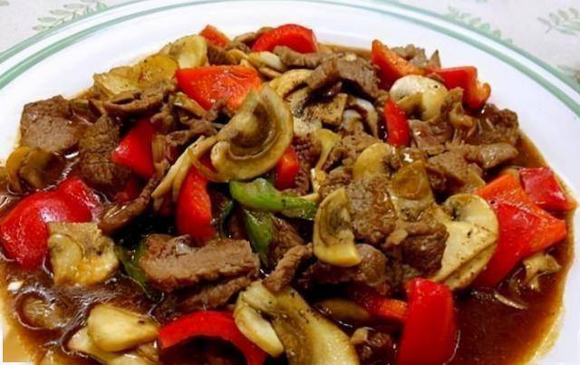 6、牛肉入锅,大火炒至开始变色,立马放蘑菇,接着立马放加了生粉后的调料汁,拌炒两下,放红椒,大火翻炒至汤汁稠撒点儿黑胡椒粉即可出锅。