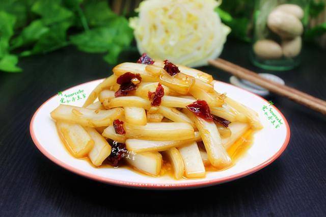 4、旺火快炒,加醋,酱油,盐,白糖煸炒至白菜呈金黄色时,用湿淀粉勾芡,淋芝麻油,颠翻均匀即可出锅。