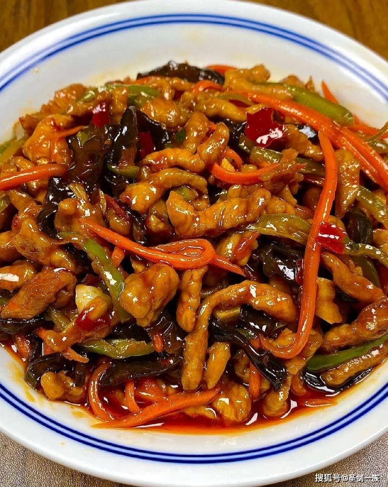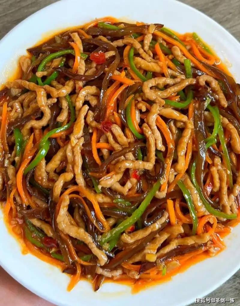 4. 放入胡萝卜丝、青椒丝和黑木耳丝,大火快速翻炒1 - 2分钟,再把炒好的肉丝倒回锅中,翻炒均匀后倒入调配好的鱼香汁,大火翻炒至汤汁浓稠,食材被料汁完全包裹即可。此菜酸甜适中带辣味,十分下饭。