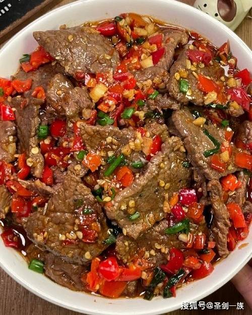 牛里脊250克、剁椒2勺、小米辣3个、大蒜4瓣、生姜2片、生抽1勺、料酒1勺、淀粉1勺、盐少许、食用油适量、葱花少许