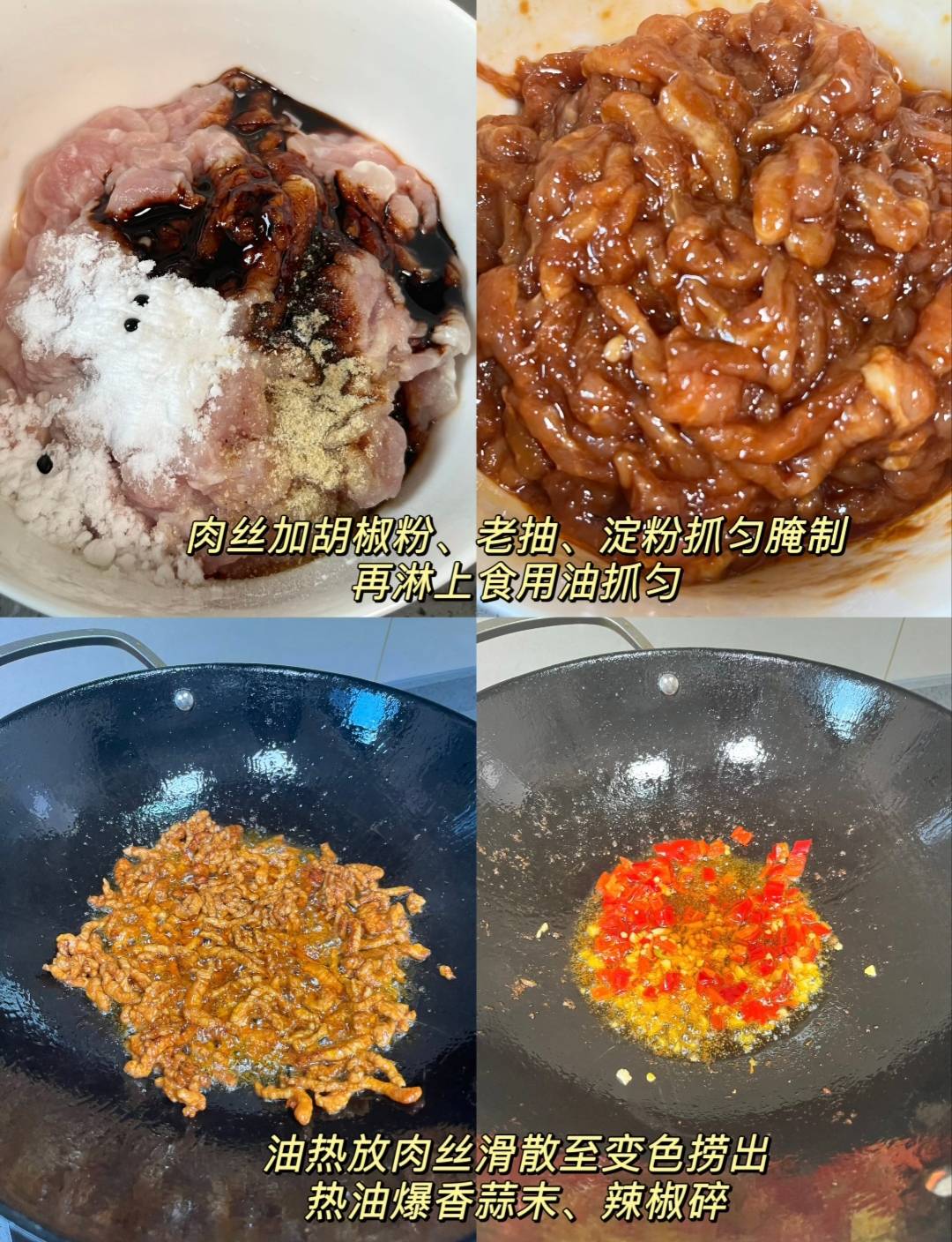 第二步:猪肉切成细丝,加入少许胡椒粉、半勺老抽、一勺淀粉,用手抓匀,腌制5分钟。最后淋入一勺食用油再次抓匀。油的包裹能让肉丝在热锅中迅速滑散,不易粘锅,炒出来嫩滑不柴。