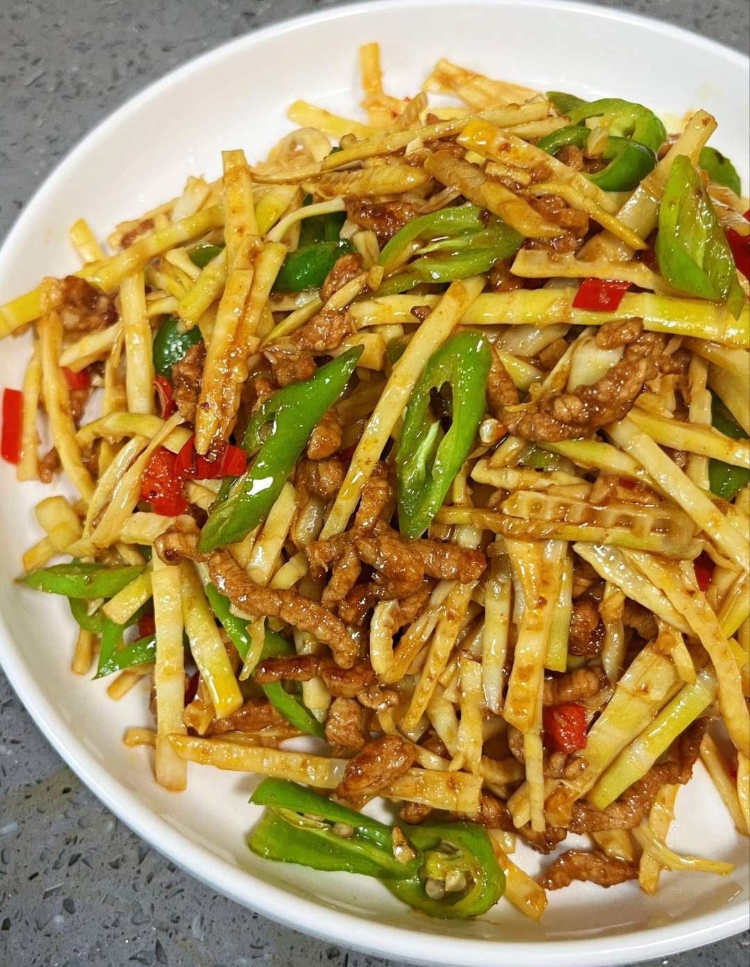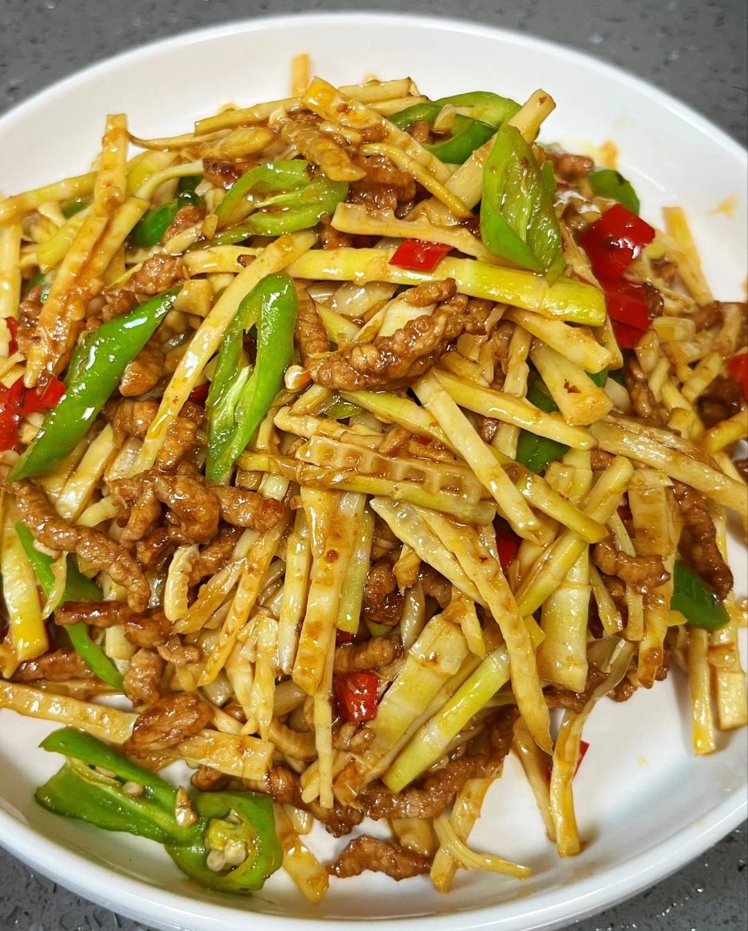 一盘春笋炒肉丝的滋味,热气腾腾的春笋炒肉丝端上桌,白色的笋丝、酱色的肉丝、翠绿的青椒、红色的干辣椒点缀其间,光是看着就让人食欲大开。夹一筷子送入口中——竹笋脆嫩爽口,轻轻一咬就发出“咔嚓”声;肉丝滑嫩入味,带着胡椒粉的微辛和老抽的酱香;青椒的清甜和干辣椒的微辣交织在一起,鲜、香、脆、嫩在舌尖上跳舞。最妙的还是汤汁拌饭。竹笋和肉丝释放出的汁水浸入米饭,每一粒米都吸饱了鲜味,一口气能吃掉两大碗。