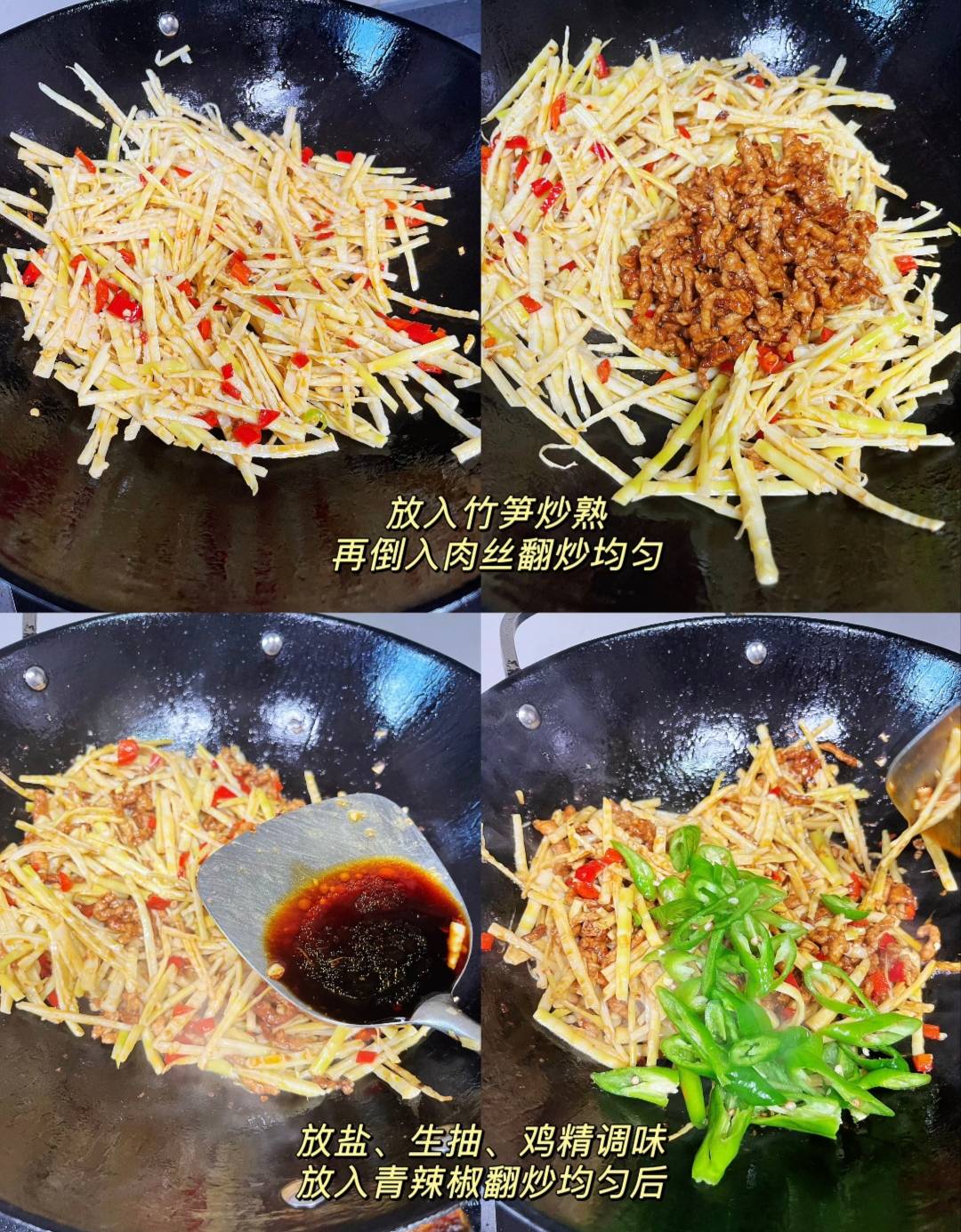 第四步:最后放青椒,保持翠绿,把肉丝倒回锅中,和竹笋一起翻炒均匀。加入半勺盐、一勺生抽、少许鸡精调味。最后放入切好的青辣椒块,大火翻炒不超过30秒就关火。这样青椒脆甜、颜色翠绿,卖相更好。