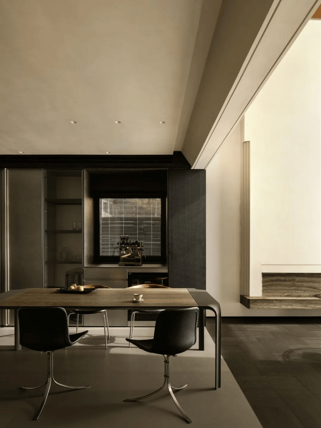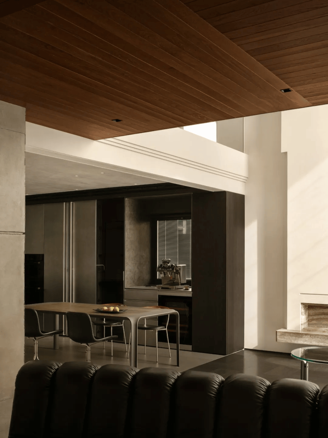在空间的表达上,设计并没有刻意强调某一种特定的风格,而是更关注比例与材料本身的关系。木材与金属的并置碰撞,既产生了未来感,又始终保持着克制。这种设计手法既体现了对材料特性的深刻理解,又展现了对空间氛围的精准把控。
