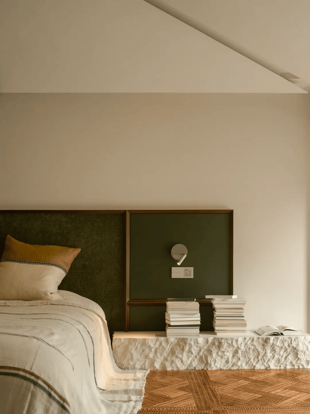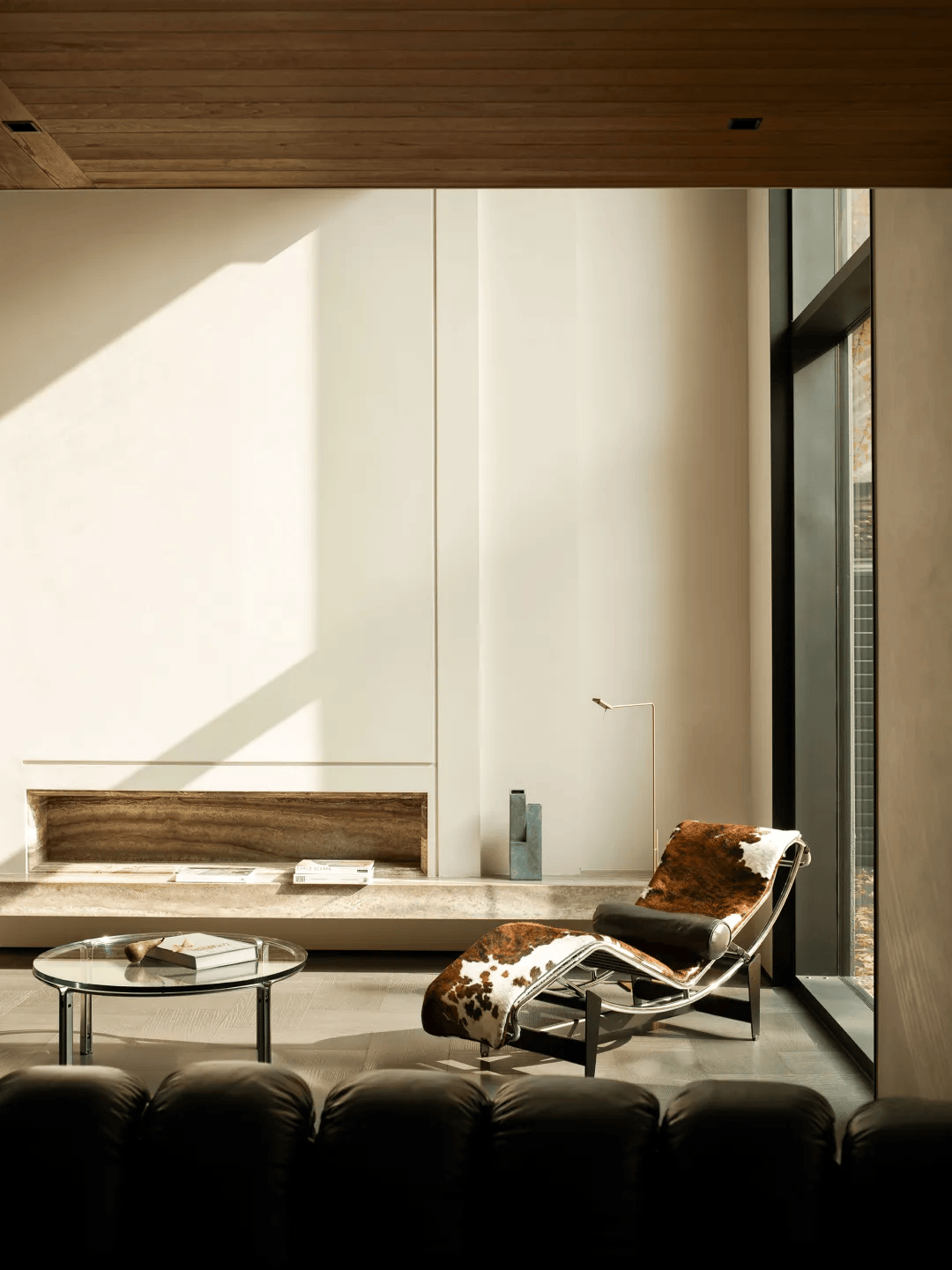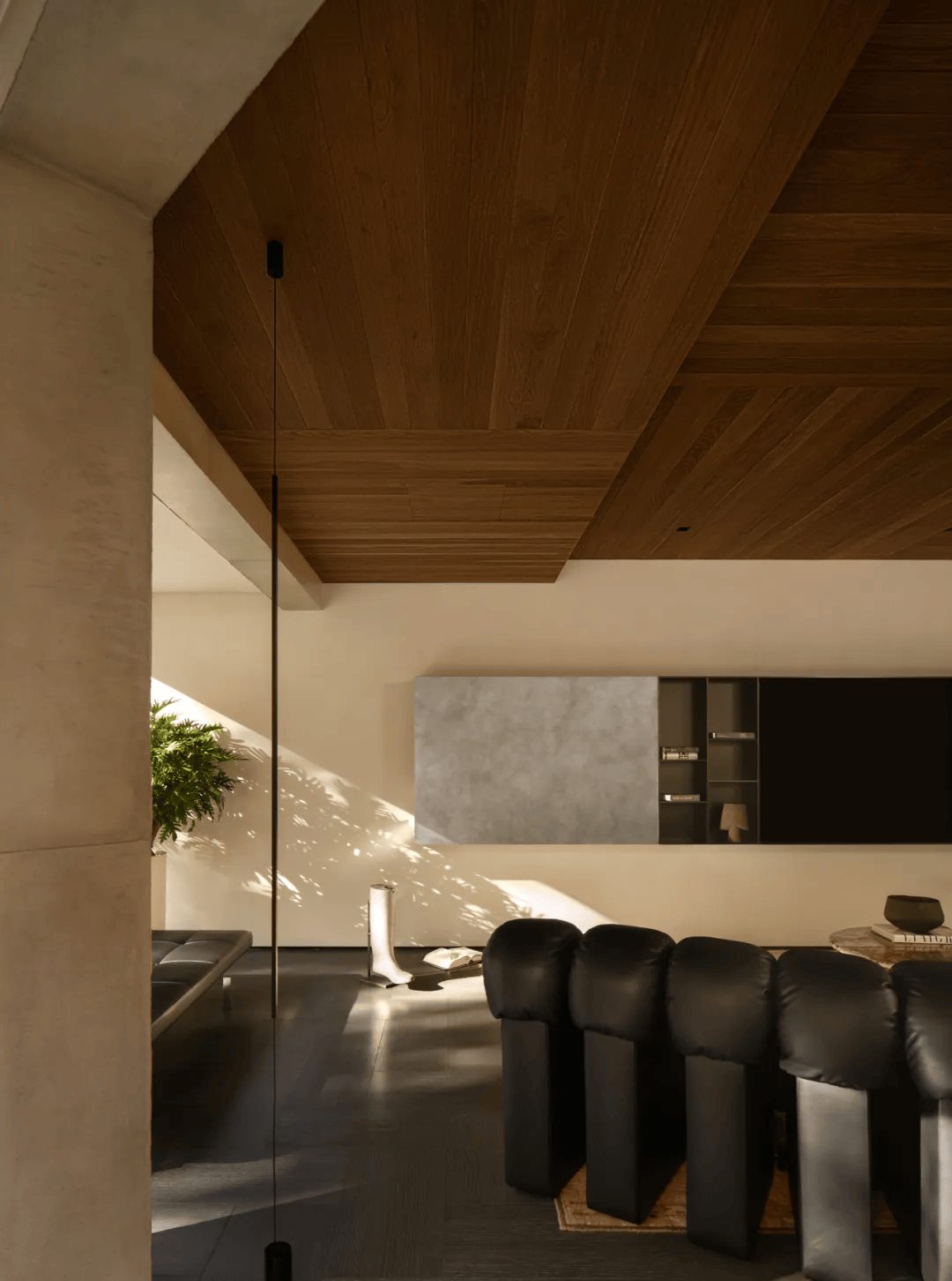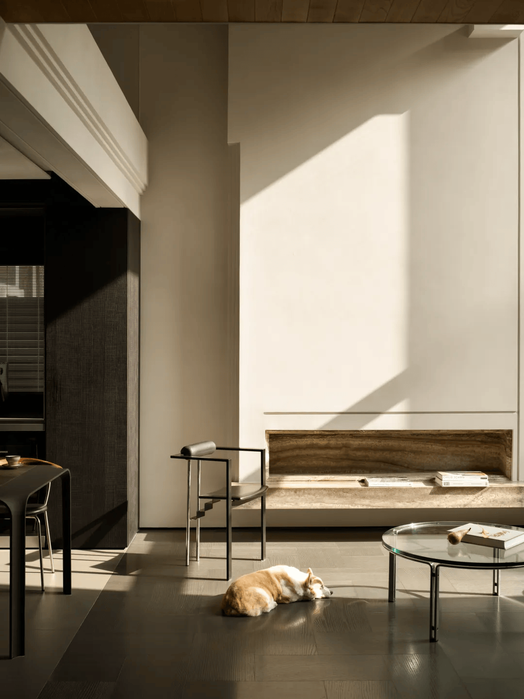 2. 梁体处理:原有建筑中的梁体并未被刻意隐藏,而是通过工艺缝进行重新整理,使其从限制转变为空间秩序的一部分。这种处理方式既尊重了建筑的结构逻辑,又赋予了空间独特的韵律感。