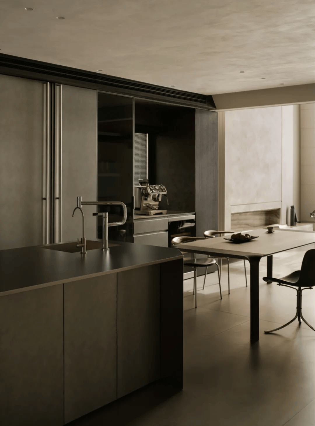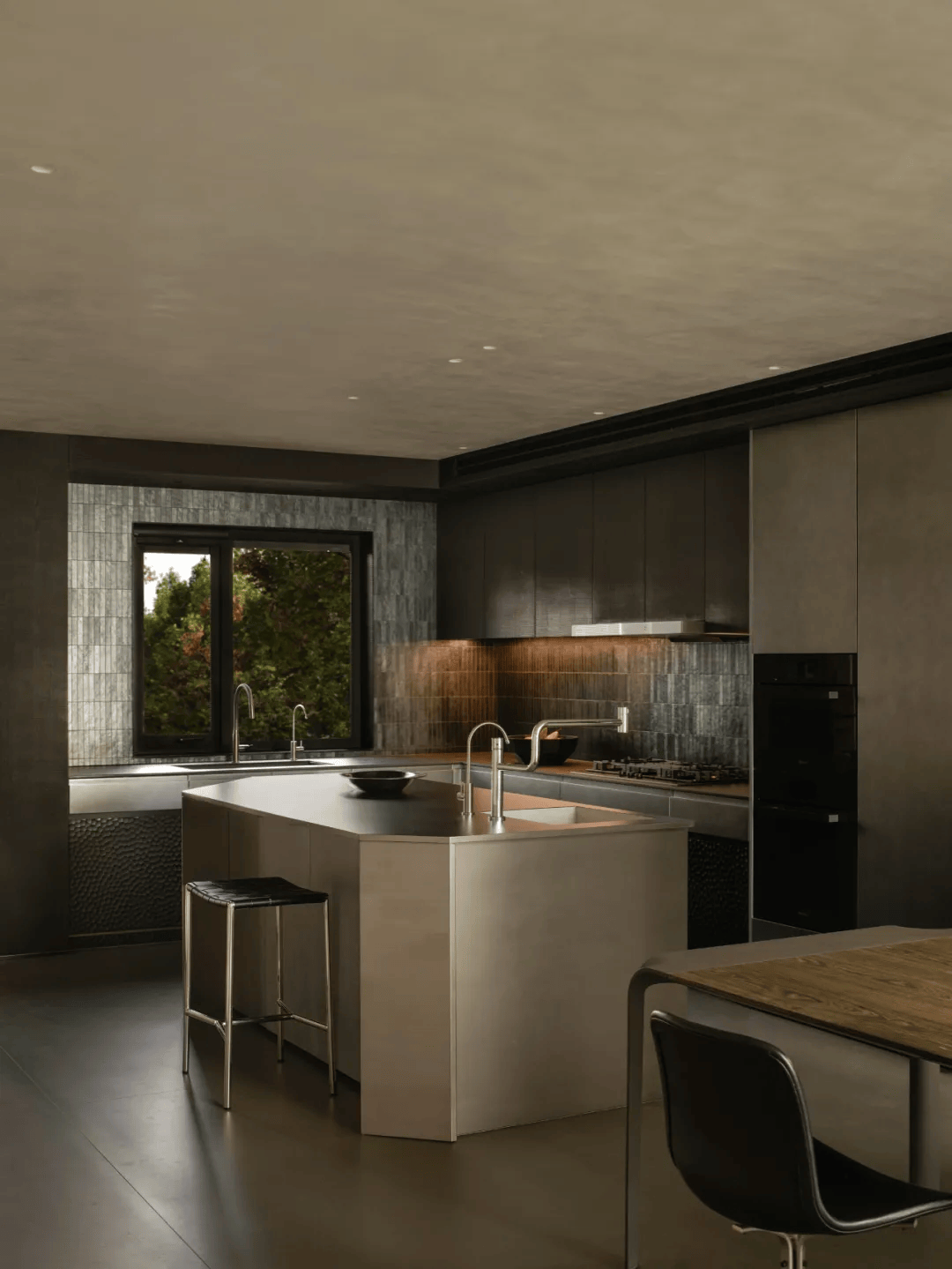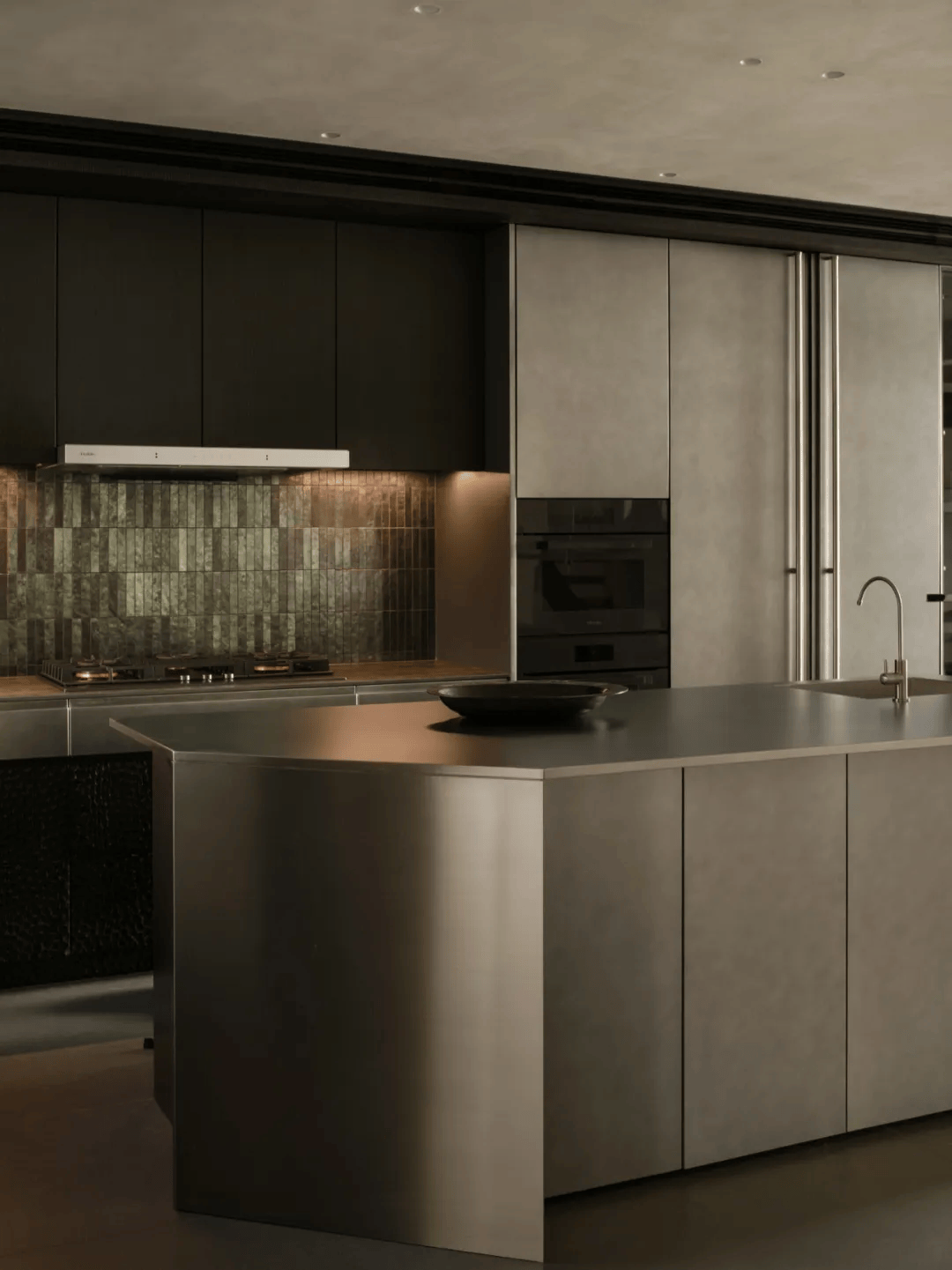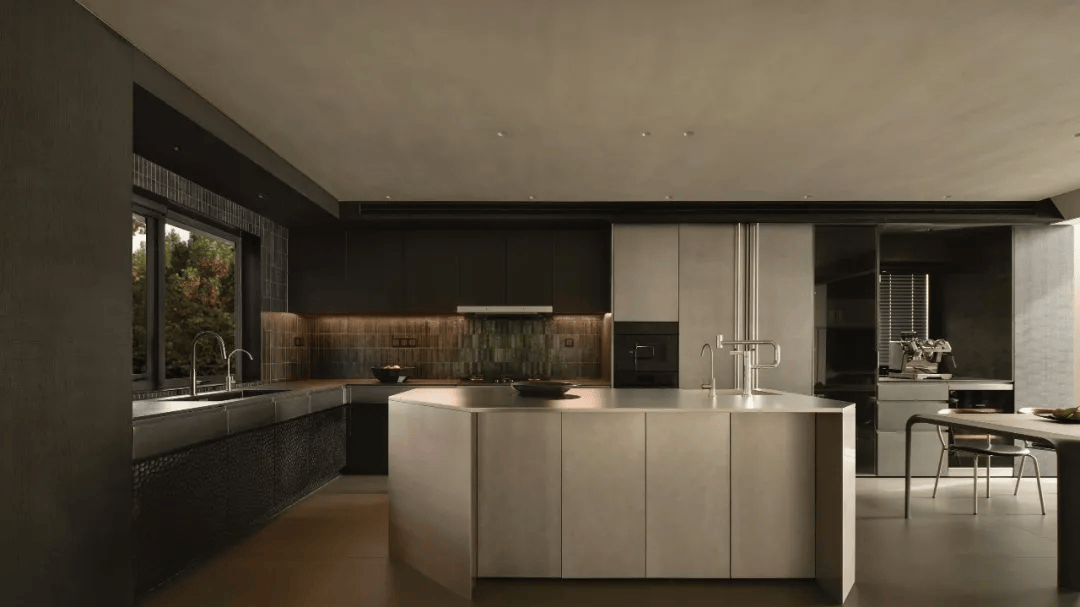 2. 橱柜与岛台:橱柜与岛台来自团队原创研发,作为同一套体系被反复推敲与打磨。整体材质以实木附以手工锤纹、液态金属漆与不锈钢为主,在不同触感与光泽之间取得平衡。这种设计既体现了对实用功能的关注,又展现了对美学价值的追求。
