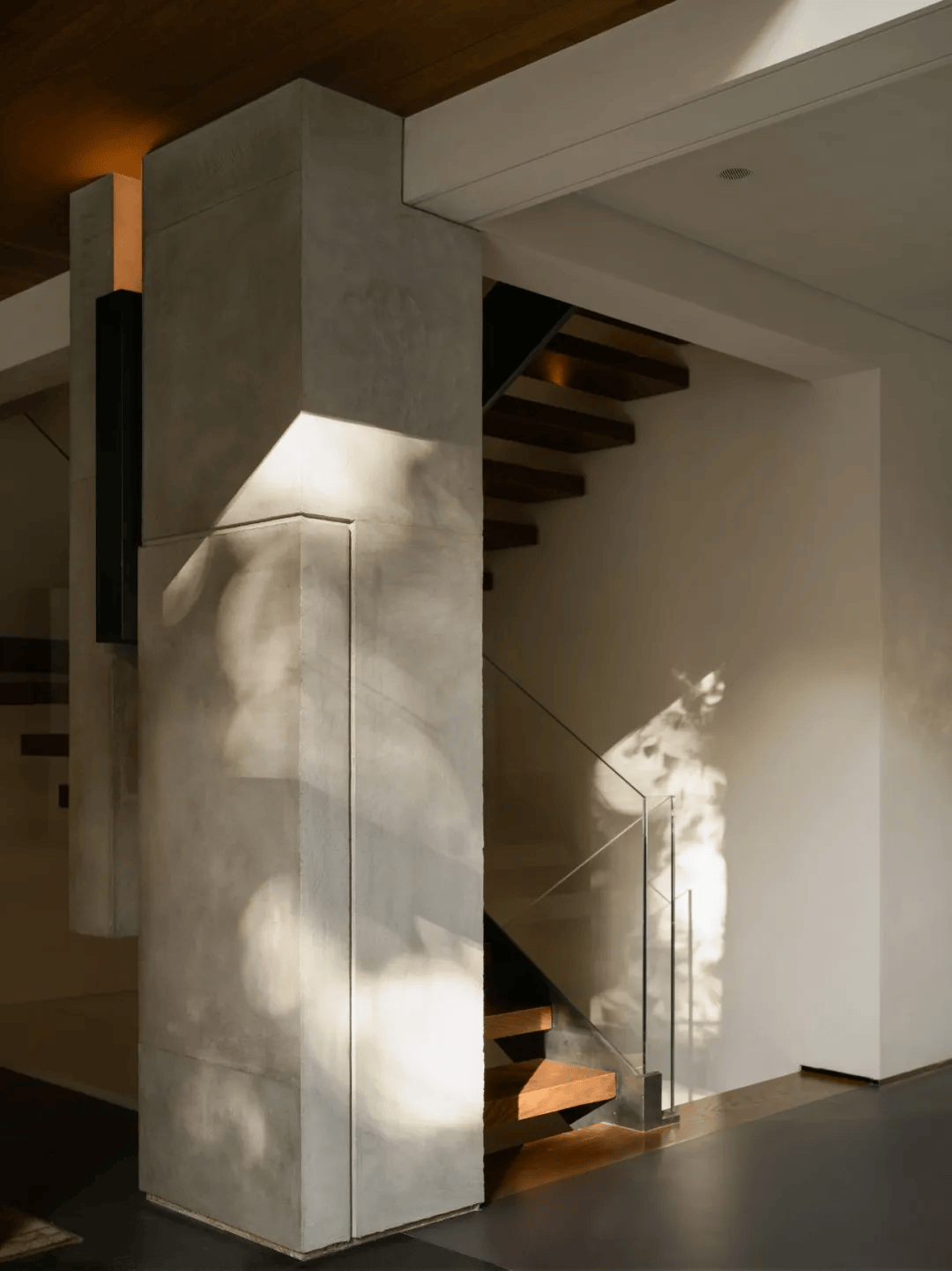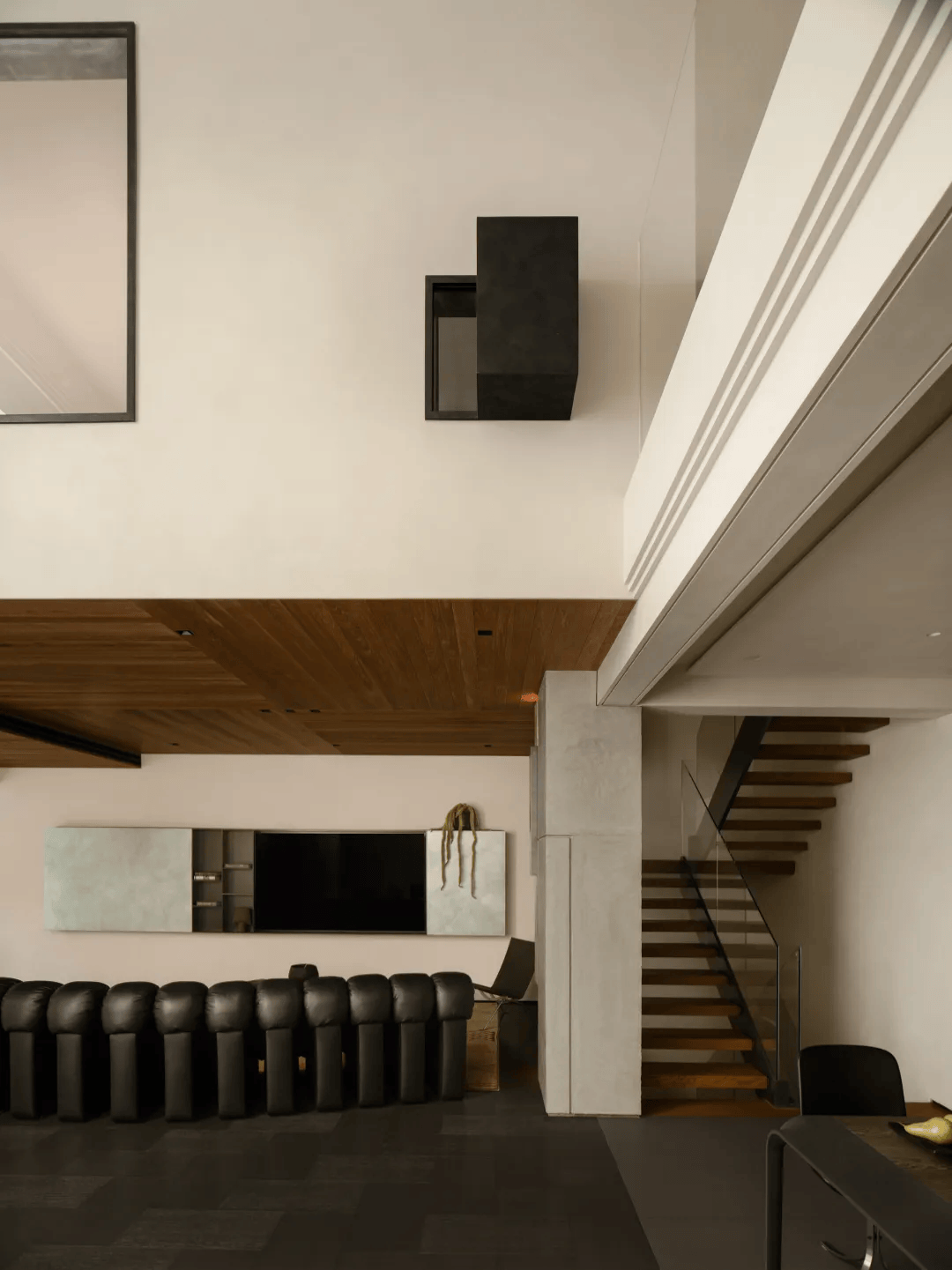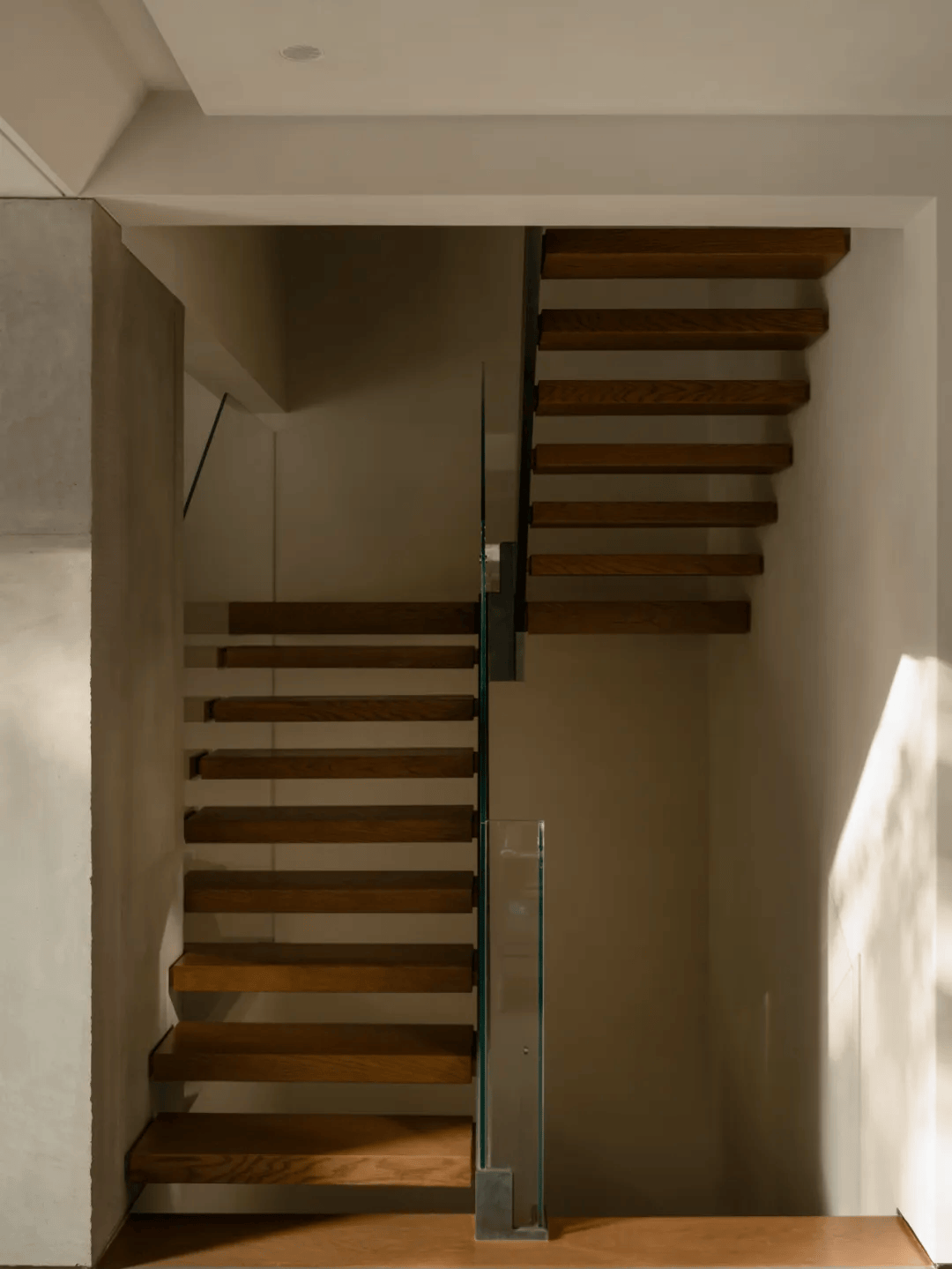 1. 楼梯改造:原本被墙体包裹的楼梯在改造中被完全释放,成为一层空间中重要的组织轴线。悬浮结构与通高玻璃的运用,不仅让踏步在空间中保持轻盈,还带来了视觉上的延展。这种设计既体现了结构与视觉的平衡,又增强了空间的通透感。