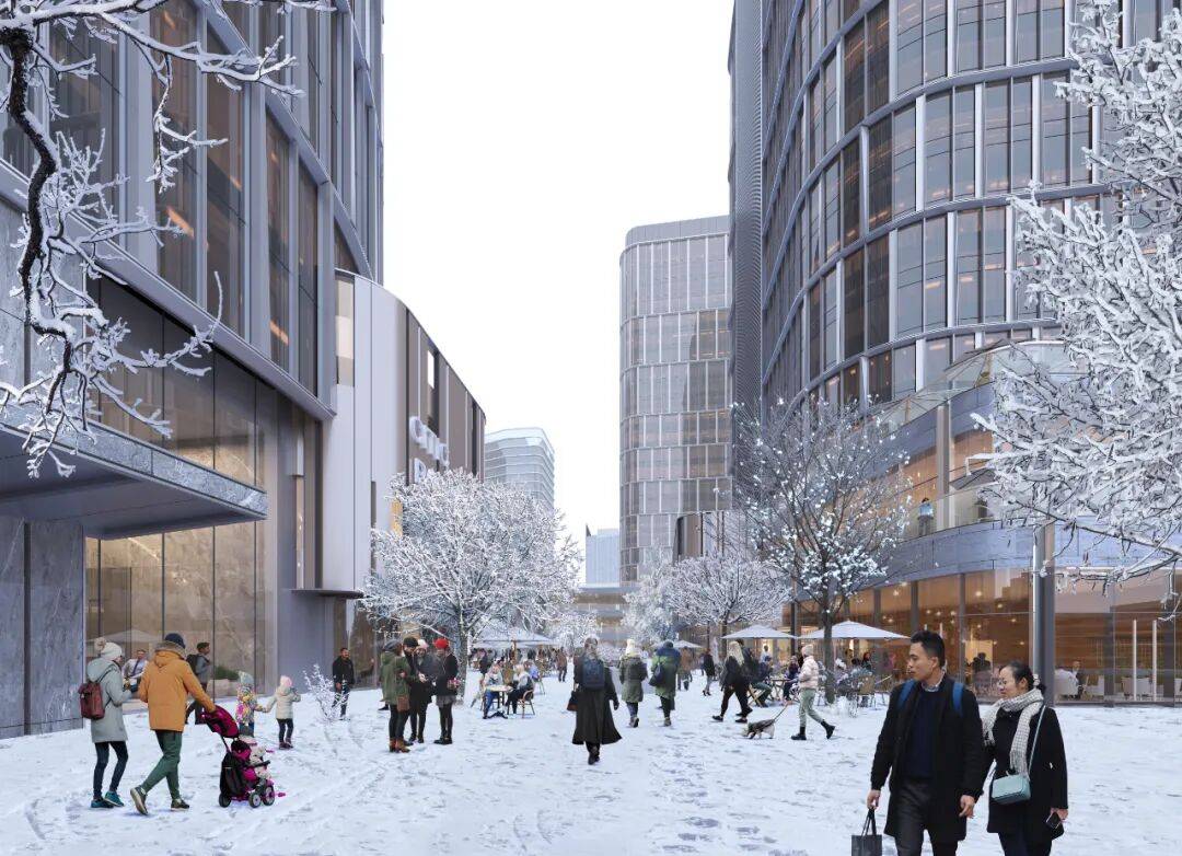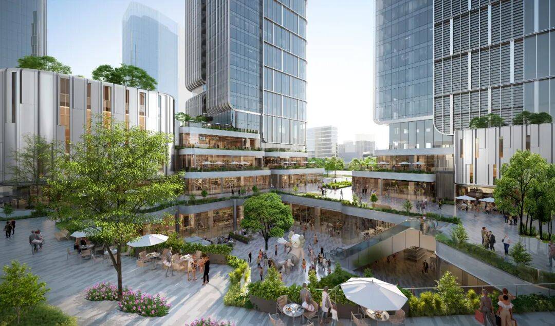 2. 零售街:作为项目大底盘的精品零售部分,设计结合当地气候特征,为办公园区及周边提供室内、外丰富的商业业态和体验。场地核心位置结合特色商业独栋和立体园林,打造轻松、惬意的公共空间,并与城市地铁系统直接连通,为购物者与通勤者提供便捷、客制化的商务配套服务。