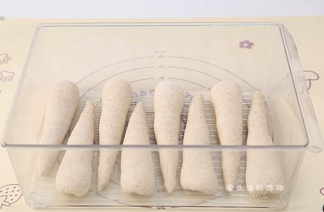 排气后分8份,擀开后做成长锥形,再密封冷藏松弛半小时。