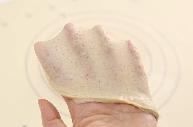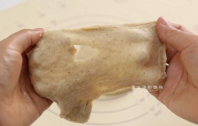 再放入黄油和鲜酵母揉到手套膜阶段,面团揉到这个阶段做出来的面包才会够柔软。