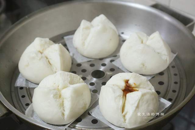 锅里烧水,开了之后放入包子胚,大火上汽蒸15分钟,这时候捏紧的口子就会爆开,一个个和酒楼里一样的包子就做好了!