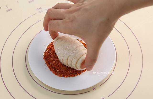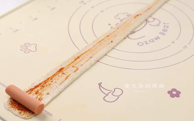 取一条擀成顶部宽5CM长为50CM的三角形,涂上一层酸甜辣酱,再放上热狗肠卷起来,最后收口超下放置。