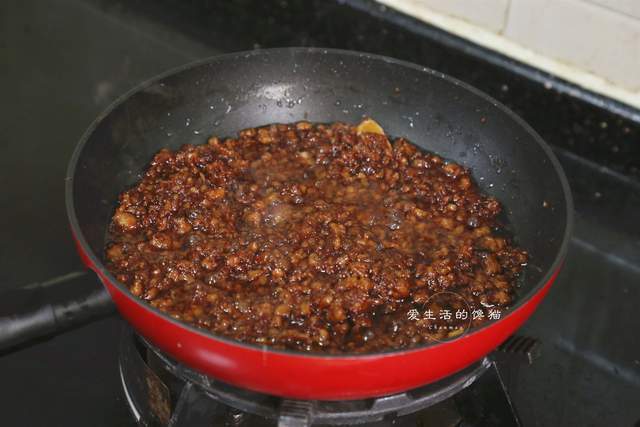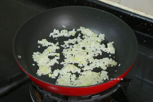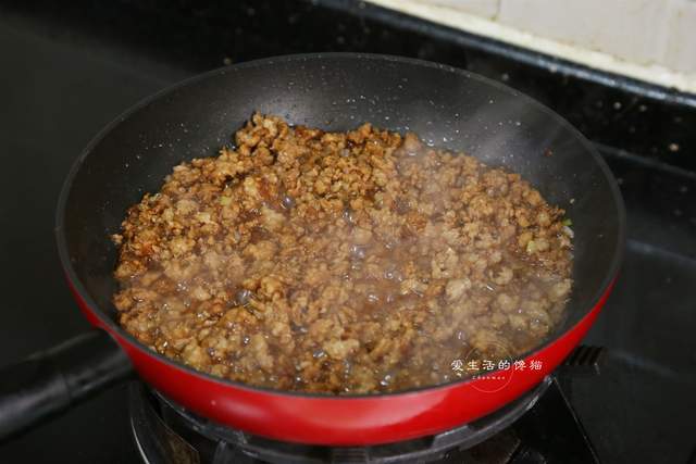 洋葱切碎,热锅倒入花生油,先把洋葱碎进去炒香,等到表面微干,香气溢出的时候倒入猪梅肉碎进去,快速炒散开。