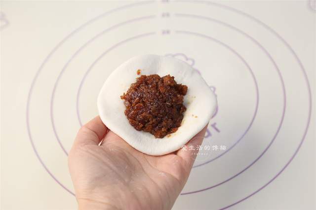 取一个面团,擀开后包入适量的叉烧馅。