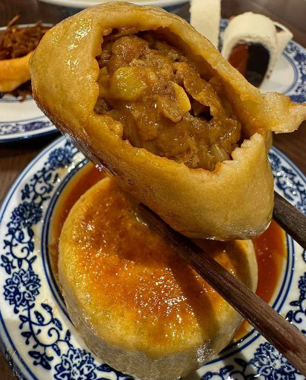 做门钉肉饼是个技术活。面要用半烫面,开水烫一半,凉水和一半,这样擀出来的皮又软又有韧性,能兜住汤汁。馅料只选牛上脑肉,手工剁碎,不能剁太细,要保留一点颗粒感。然后往里打水,一边打一边朝同一个方向搅,直到肉馅吸饱了水变得黏稠。包的时候更是考验,皮要擀得中间厚边缘薄,舀一大勺肉馅,像包包子一样收口,但口必须捏死,不然煎的时候汤汁全跑了。最后收口朝下按扁,放进油锅里小火慢煎。