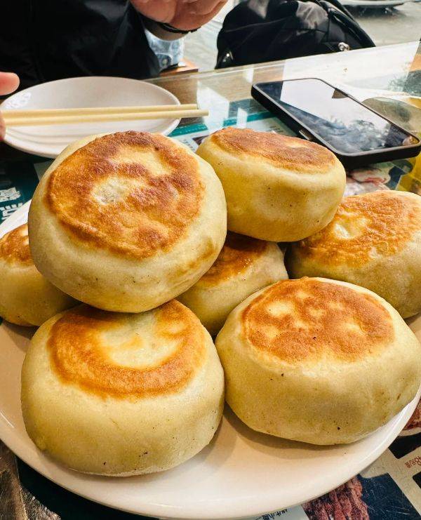 刚出锅的门钉肉饼是最佳食用时间,皮脆汁满,肉香扑鼻。正确的吃法是:先在皮上咬一个小口,把滚烫的肉汁吹凉一些,然后一口吞下。肉馅紧实有嚼劲,葱香和肉香完美融合,底部的焦脆皮更是精华。有人喜欢蘸醋,有人喜欢就蒜,老北京人则喜欢配一碗小米粥,解腻又暖胃。一位常来的出租车司机告诉我,他跑了二十年车,这家店的门钉肉饼是他吃过最好的,“有时候绕路也要来,就为了这一口烫嘴的汁。”