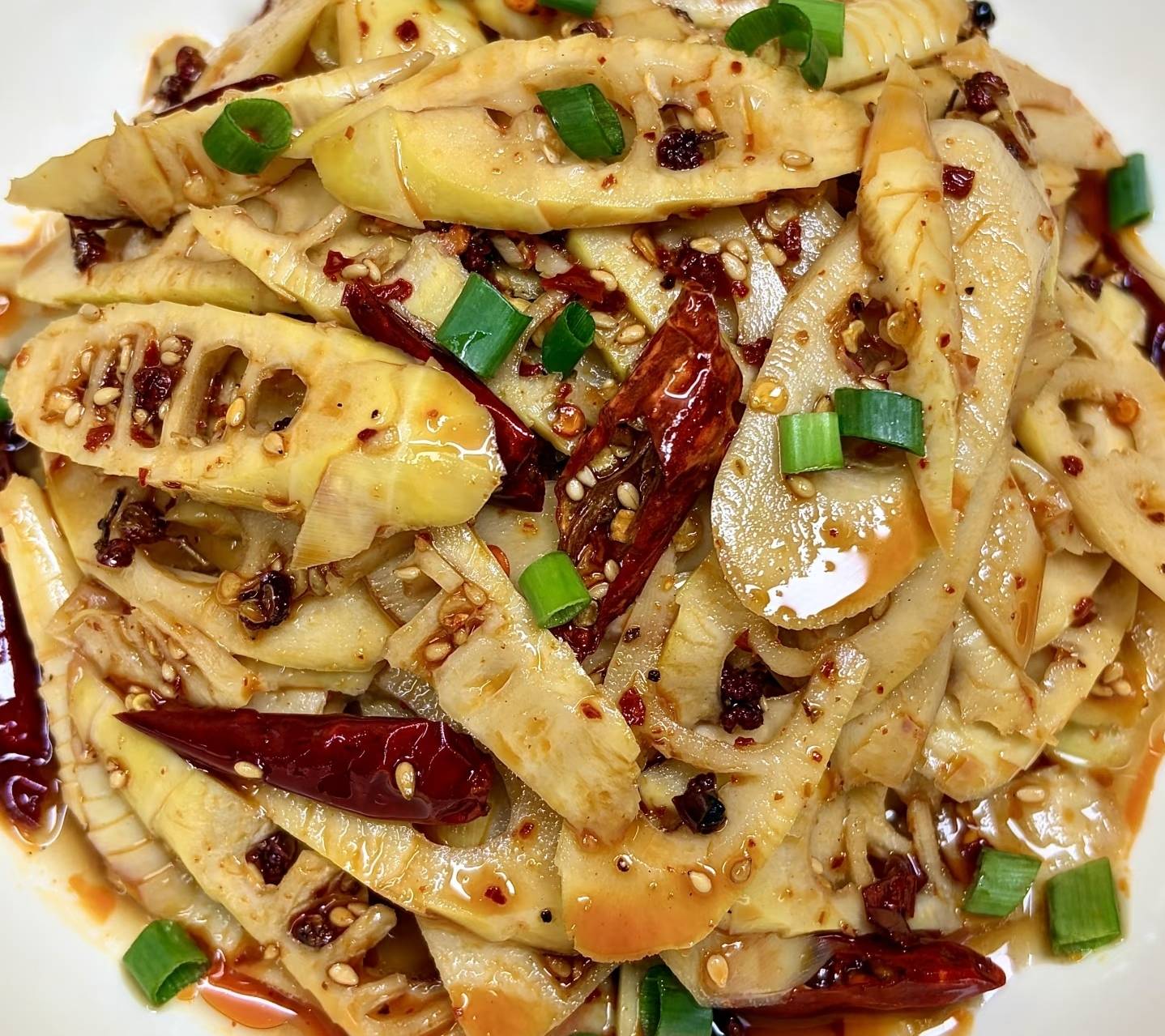 食材准备:春笋、干辣椒、干花椒粒、辣椒粉、白芝麻、小葱
