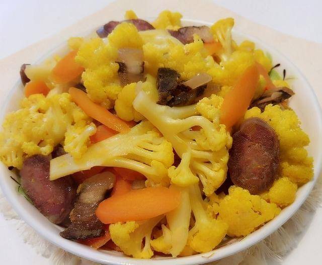 材料:黄菜花、胡萝卜、腊肉、腊肠、蒜、蚝油