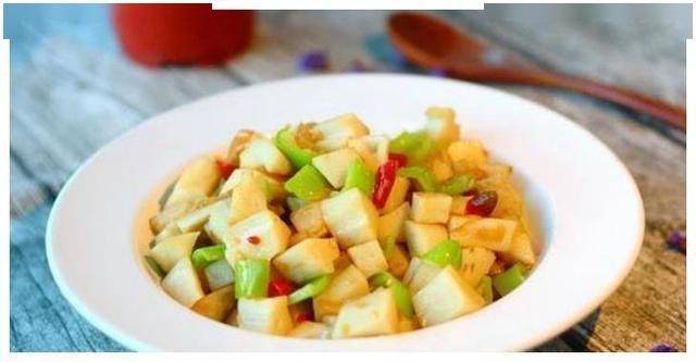4、翻炒至莲藕丁表面变色时加入香醋快速翻炒均匀,加入青椒和盐,炒入味后关火出锅食用;