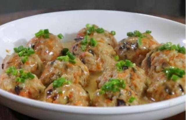 3、平底锅倒入少锅橄榄油烧热;放入香菇末、胡萝卜末、盐、水烧开,再用水淀粉勾芡调匀;淋在蒸好的肉丸上即可